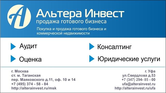 - Федеральная компания "Альтера Инвест" предлагает Вам ознакомиться с другими предложениями о продаже готового бизнеса на нашем сайте alterainvest.ru.Мы работаем без комиссии для покупателя!
