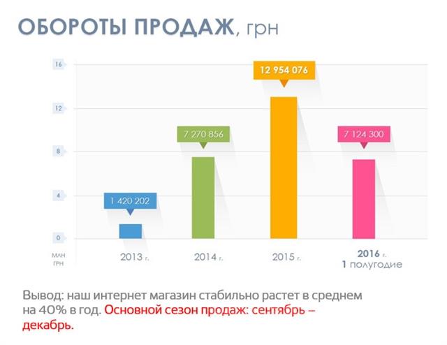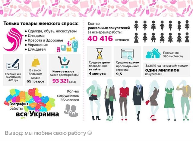 Предлагаем к продаже интернет-магазин, входящий в 5ку крупнейших магазинов раздела Одежда/Обувь в Украине по международному рейтингу Similarweb.com. Объем рынка интернет-продаж в Украине – 1,7 млрд долл. Рынок интернет самый быстрорастущий в Европе. Кол-во интернет- пользователей – 20 млн человек. Категории интернет-магазина: одежда, обувь, аксессуары, товары для дома и для детей, косметика и парфюмерия, товары для творчества. Более 65 000 товаров. Бизнесу 3 года. Работает в самом быстрорастущем сегменте продаж в интернет - рынок одежды, обуви, товаров для дома. Регион – вся Украина. Оборот продаж – до 600 тыс долл/год. Маржинальность от 28 до 35%. Рост магазина – 40 - 60% ежегодно. Потенциал роста – до 100% в год. Посещаемость сайта магазина – 300 000 посетителей в месяц, которые просматривают более 2 млн. страниц в месяц. Более 40 000 покупателей в базе, которые совершили более 100 000 заказов. За 2015 года сайт магазина посетило более 1 млн покупателей. Что у нас есть? • Опытные люди, преданные бизнесу • Ноу-хау в интернет-продажах (как стимулировать рост продаж без постоянной рекламы) • Перспективный рынок и 250+ поставщиков – партнеров • Зарегистрированная ТМ с высокой репутацией и доменное имя в зоне UA. • Товарные остатки в размере 20% оборота в месяц • Все бизнес-процессы автоматизированы и программы синхронизированы между собой • Из 300 тыс – от 60 до 130 тыс посещений в месяц – это «органика» - источник без рекламы. Оценочная емкость органического трафика в месяц – 560 тыс (расчеты есть) Посмотрите, пожалуйста, в удобных графиках представлена вся статистическая информация по проекту. К продаже предлагается от 80% до 100% бизнеса. С удовольствием встретимся и ответим на все вопросы. Наша мечта – видеть магазин точкой входа для женской аудитории украинского ecommerce.