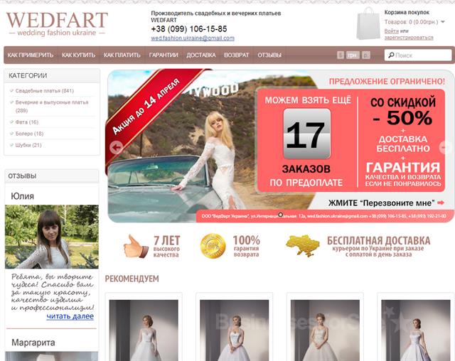 Интернет-магазин свадебных и вечерних платьев Средний чек - 5500 грн. Средняя прибыль с транзакции - 2100 грн. Конверсия при работе консультанта онлайн - 1% с горячего траффика Возраст проекта - 2 года Переход прав происходит так: 0) (при необходимости) заключаем договор купли- продажи 1) мы передаем вам права доступа к админ- панели 2) мы передаем вам исходники дизайна 3) мы передаем вам настроенные контекстные кампании 4) вы оплачиваете покупку (на расчетный счет или карту) 5) мы передаем вам доступ к хостингу и доменному имени 6) (при необходимости) мы подписываем акт приема-передачи выполненных услуг и направляем вам по электронной и живой почте.вы подписываете и отправляете нам назад Сайт проиндексированн поисковиками и отсутствует в черных списках. Все отзывы положительные. Есть сертификаты партнеров и видео-отзывы клиентов. Для успешной работы необходимо инвестирование в контекстную рекламу 300 долларов в месяц (она уже настроена) и присутствие консультанта в чате, т.к. специфика ниши требует общения с перед продажей. Большинство сделок заключается ПРЕДОПЛАТЕ! Настроена система перевода денег по безналу через VISA / MasterCard, на банковские реквизиты или просто на карту ФЛП. Продается с большой скидкой 25% в связи с переходом в другую сферу деятельности (разработка сайтов). Бизнес очень рентабельный. Особенности: -бизнес требует "женской руки"; -сезонность сильно не сказывается на продажах в отличие от свадебных салонов; -магазин работает по украине и россии (доменные имена wedfart.ru и wedfart.in.ua); Покупателя введем в курс дела и дадим рекомендации по работе. СРОЧНО! СКИДКА 25% покупателю!