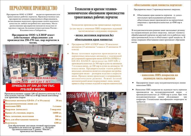 Действующий цех производства х/б перчаток. Стоимость 15000000 рублей. Возможен вариант продажи цеха без объекта недвижимости.