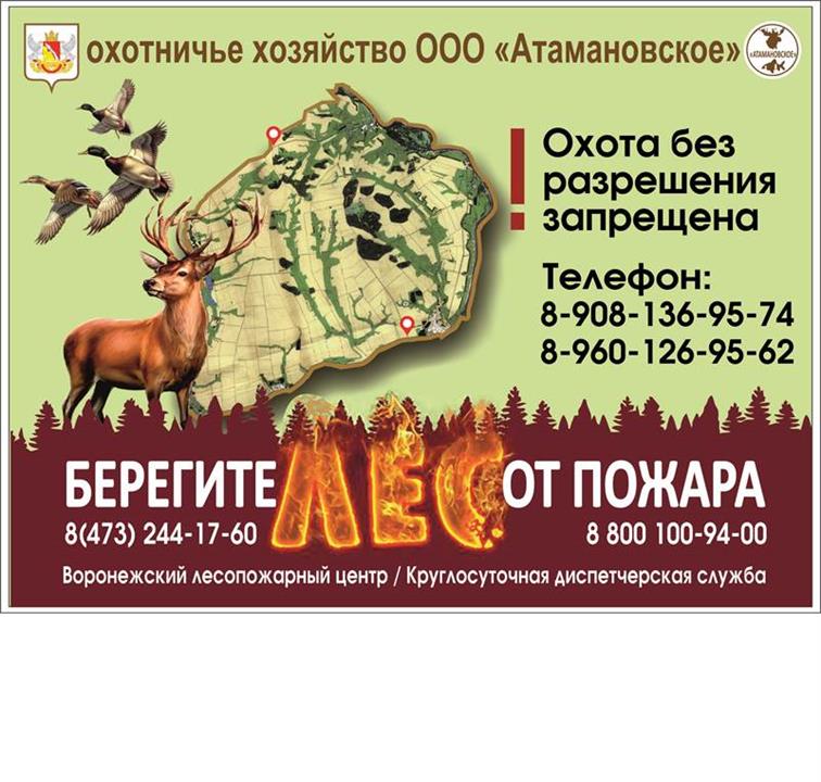 Охотничье хозяйство расположено на юго-западе Воронежской области (Россошанский р-он) в живописном месте удаленном от "случайных" посетителей. 50°13’26″N 39°57’02″E Объектом продажи является право пользования объектами животного мира на основании охотхозяйственного соглашения, заключенного 28.07.2014 года на 49 лет (осталось 41 год). Расстояние до базы охотхозяйства от Воронежа – 245 км, расстояние от Россоши – 34 км, расстояние от трассы М-4 – 86 км (поворот на 712 км трассы в селе Верхний Мамон). Общая площадь составляет 26 780 га из которых: леса – 2377 га, пашни -17 900 га, луга – 5797 га. На территории базы охотхозяйства расположены два бытовых вагончика, два склада для хранения соли, зерна, стройматериалов. Имеется два вольера для собак, хозяйственные постройки для разделки туш и кремации отходов. На территории охотничьих угодий содержатся охотничьи вышки, подкормочные площадки, солонцы. Основные виды животных - косуля, кабан, проходной лось, заяц-русак, лисица, барсук, бобр, куница, сурок-байбак, из пернатых – фазан, вальдшнеп, утка. В штате предприятия – 7 человек, опытные егеря с многолетним опытом работы организуют результативную охоту. Для этого имеется в наличии: 1. Автомобиль УАЗ (буханка) - 2 шт. 2. Автомобиль Ваз-2131 «Нива» - 4 шт. 3. Снегоход Ямаха викинг – 2 шт. 4. Автомобильный прицеп – 1 шт. Лицензия, имущество, сотрудники и т.д. оформлены на действующее ООО. – правообладателя охотхозяйственного соглашения. Подробности — по телефону.